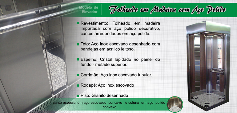 Revestimento: Folheado em madeira importada com aço polido decorativo, cantos arredondados em aço polido.