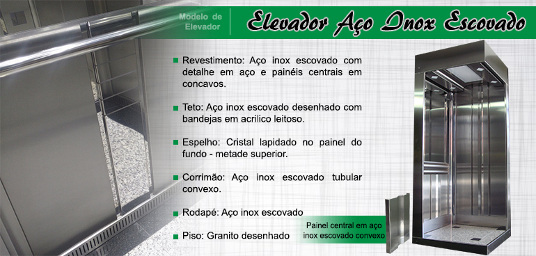 Revestimento: Aço inox escovado com detalhe em aço e painéis centrais em concavos.